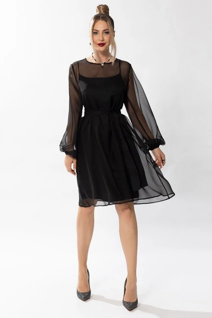 Платье, расширеного к низу силуэта с застежкой на навесную петлю и пуговицу по горловине спинки, без воротника, с круглым вырезом горловины. Платье двуслойное , со съемным поясом. Нижнее платье на бретелях, с нагрудными вытачками по переду. Рукав втачной, длинный, с отрезной манжетой, присборенной на резинку.