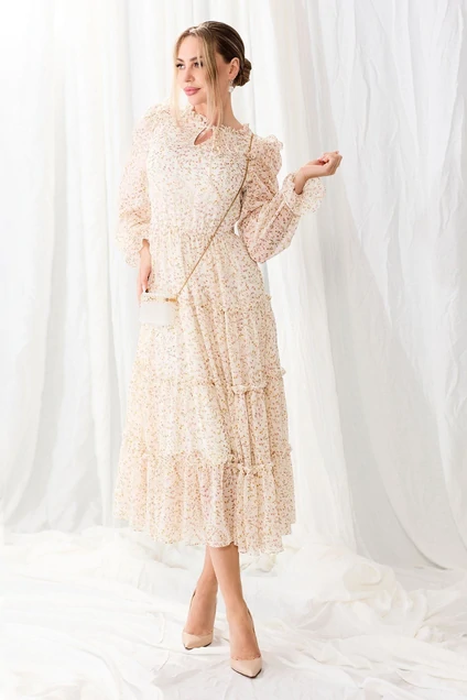 Платье полуприлегающего силуэта c втачным воротником- стойкой в виде рюши, застежкой на потайную молнию в левом боковом шве. Горловина переда с вырезом- капелькой и шнуром- завязками. Платье отрезное по линии талии, шов по талии присборен на резинку. Верхняя часть переда с нагрудными вытачками. Верхняя часть впинки с талиевыми вытачками. Нижняя часть платья с четырьмя рядами воланов Рукав втачной, длинный, со сборкой по окату. По низу рукава- сборка на резинку. По окату рукава- рюша.