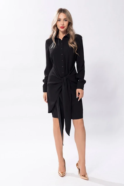 Платье полуприлегающего силуэта с рубашечным воротником. Платье отрезное по линии талии. По лифу переда обработаны планки с застёжкой на петли и пуговицы. Спинка со средним швом, талиевыми вытачками. Нижняя часть платья расширенная к низу. Рукав втачной, длинный с манжетой. На талии завязывается бант.