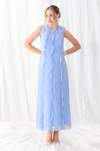 Платье расширенного к низу силуэта, с застежкой на потайную молнию в среднем шве спинки, без воротника, без рукавов, с круглым вырезом горловины. По переду с рельефами, выходящими из горловины до низа. Из рельефов выходят рюши. Спинка со средним швом, талиевыми вытачками.