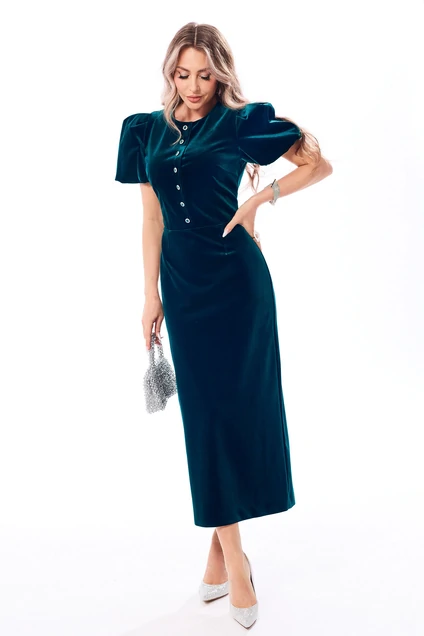 Платье без воротника, с круглым вырезом горловины, центральной застежкой на петли и пуговицы по лифу переда. Платье отрезное по линии талии. По лифу переда с нагрудными вытачками. Спинка со средним швом, заканчивающимся разрезом, талиевыми вытачками. Рукав втачной, короткий, по низу, присборен на резинку. Окат рукава присборен.