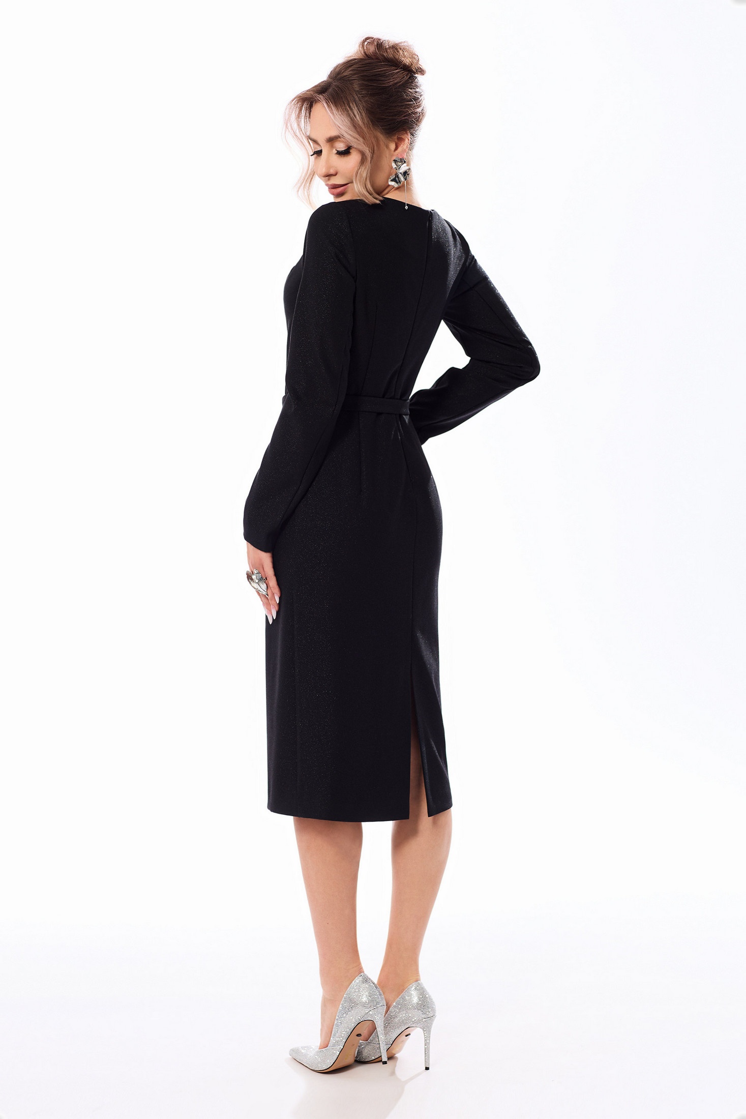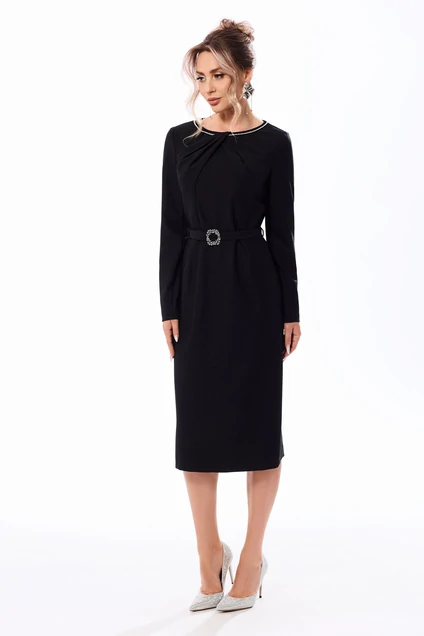 Платье без воротника, с фигурным вырезом горловины, застежкой на потайную молнию в среднем шве спинки. Платье отрезное по линии талии. По горловине переда фигурная драпировка со складками, горловина переда с отрезной планкой, декорированной тесьмой со стразами. Спинка со средним швом, заканчивающимся разрезом, талиевыми вытачками. Рукав втачной, длинный. Платье со съемным поясом. Силуэт: полуприлегающий. Вид покроя рукава: втачной. Цветовая гамма для верха, подкладки, фурнитуры, отделки: платье из ткани в одной цветовой гамме. Тип ткани: текстильный, плательный, Комплектация: платье на подкладке