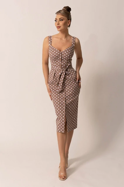 Платье с центральной застежкой на петли и пуговицы, на широких бретелях. Платье отрезное по линии талии. Верхняя часть переда с талиевыми вытачками, нижняя часть переда с карманами и односторонними складками по талии. Нижняя деталь спинки с талиевыми вытачками. Платье со съемным поясом.