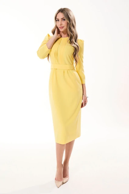 Платье с центральной застежкой на потайную молнию в среднем шве спинки, круглым вырезом горловины. Платье отрезное по линии талии. Верхняя часть переда с нагрудными вытачками, односторонними складками по центральной части переда. Нижняя часть переда с односторонними складками по шву притачивания к верхней части. В боковых швах расположены карманы. Спинка со средним швом, заканчивающимся шлицей, талиевыми вытачками. Платье со съемным поясом.