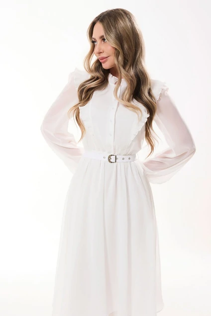 Платье, с воротником- стойкой, центральной застежкой на петли и пуговицы. Платье отрезное по линии талии. Шов по талии присборен на резинку. Верхняя часть переда с рельефами, выходящими из плеча, рюшей, выходящей из рельефов. Верхняя часть спинки с рельефами, выходящими из плеча и рюшей, выходящей из рельефов. Рукав втачной, длинный, с отрезной манжетой. По окату и шву притачивания манжеты рукав присборен. Платье со съемным поясом.