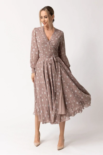 Платье без воротника, без застежки, полочки зафиксированы поясом- завязкой, на уровне груди полочки зафиксированы пришивной кнопкой. Платье отрезное по линии талии. Верхняя часть полочек с нагрудными вытачками. Верхняя часть спинки с талиевыми вытачками. Нижняя часть платья расклешенная. Рукав длинный, с отрезной манжетой. Окат и низ рукава присборен. Платье со съемным поясом. Платье на подкладке.