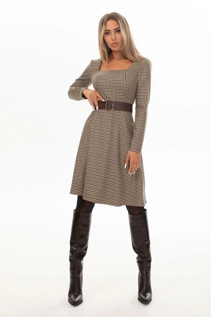 Платье с застежкой на потайную молнию в среднем шве спинки, без воротника, с квадратным вырезом горловины. Платье отрезное по линии талии. По верхней части переда рельефы, выходящие из горловины. Спинка со средним швом, талиевыми вытачками. Нижняя часть платья расклешенная. Рукав втачной, длинный. Платье со съемным поясом.