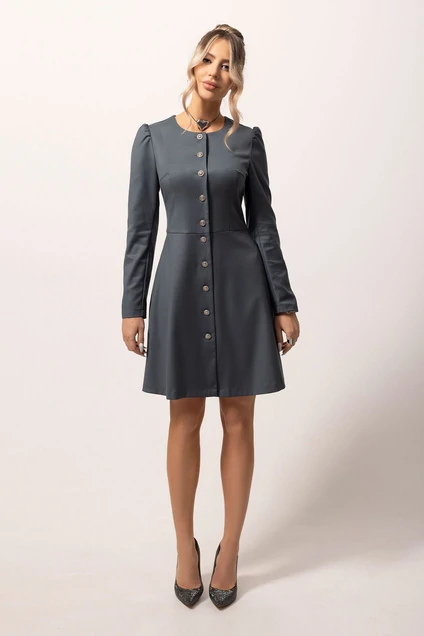 Платье без воротника, с центральной застежкой на петли и пуговицы, с круглым вырезом горловины. Платье отрезное по линии талии. Верхняя часть переда с нагрудными и талиевыми вытачками. Верхняя часть спинки со средним швом, талиевыми вытачками. Нижняя часть платья расклешенная. В боковых швах расположены карманы. Рукав втачной, длинный. По окату рукав присборен.