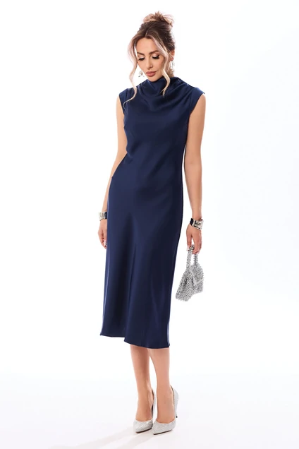 Элегантное платье миди насыщенного темно-синего цвета – идеальный выбор для изысканных мероприятий и официальных выходов. Модель выполнена без воротника и дополнена оригинальной фигурной драпировкой по горловине, что добавляет изящества образу. Платье застегивается на навесную петлю и пуговицу в среднем шве спинки, обеспечивая идеальную посадку и комфортное ношение. Нагрудные вытачки спереди и талиевые вытачки на спинке подчеркивают фигуру, делая акцент на талии.