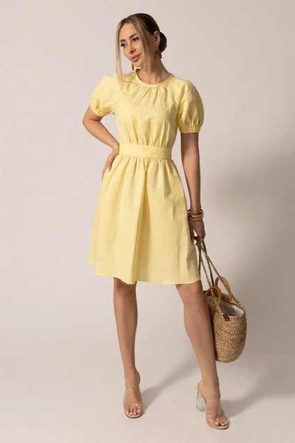 платье без воротника, с круглым вырезом горловины, застежкой на навесную петлю и пуговицу по горловине спинки, и на потайную молнию в среднем шве спинки. Платье отрезное по линии талии с втачным поясом по переду. Из боковых швов выходят декоративный пояс- завязки. Верхняя часть переда со сборкой по горловине и сборкой по талии. Нижняя часть платья со сборкой по талии. Рукав короткий, реглан, с отрезной манжетой, присборенной на резинку. В боковых швах расположены карманы.