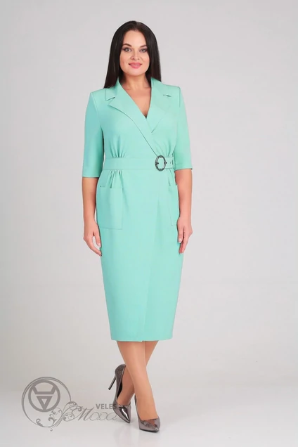 Платье приталенного силуэта с воротником пиджачного типа "на запах". По линии талии имитация пояса с пряжкой, по переду от пояса вверх и вниз сборка. В нижней части переда два накладных кармана. Задняя часть платья со средним швом и талиевыми вытачками. Потайная застежка-молния в боковом шве. Рукава втачные одношовные. Длина платья - 117 см , длина рукава 38 см (+\- 2 см)