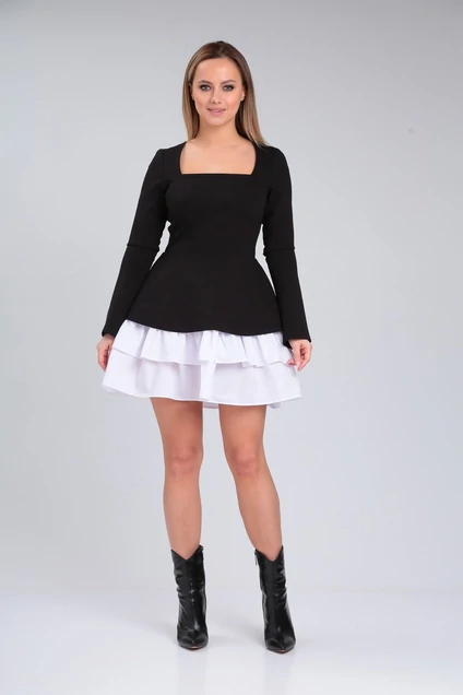 Платье прилегающего силуэта с втачным рукавом.Спинка удлиненная на молнии.Лиф платья с рельефами выходящими из проймы.Горловина платья обработанна вырезом каре.Юбка платья со сьемным воланом,фиксируемый на тесьме с кнопками.Платье возможно носить без волана как тунику.(Юбка)97%полиэстер.3%спандекс.