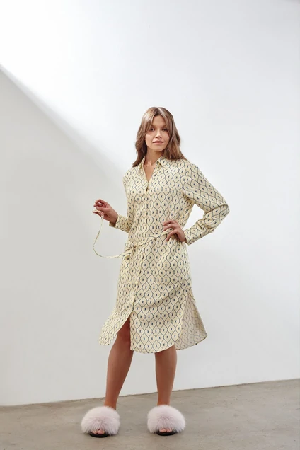 Платье-рубашка прямого силуэта под пояс с разрезами по бокам. Спущенная линия плеча, длинные рукава с манжетами. Отложной воротник рубашечного покроя, застежка на пуговицах.