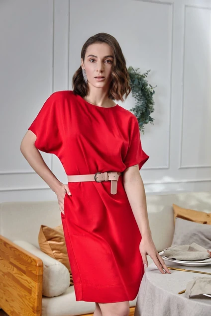 Прямое платье свободного кроя с короткими рукавами. Спущенная линия плеча. Карманы в боковых швах. Декор по спинке - петелька с завязкой.