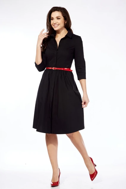 Элегантное женское платье полуприлегающего силуэта, классической длины, отрезное по линии талии со сборкой, изготовлено из натуральной хлопковой ткани. Горловина оформлена рубашечным воротником со стойкой, центральная потайная застежка планки на петли-пуговицы. Перед изделия с рельефами в верхней части и боковыми карманами по юбке, спинка с талиевыми вытачками. Рукава с цельнокроеным манжетом и декоративными пуговицами контрастного цвета. Можно снятьпуговицы и ширина рукава по низу увеличится на 3см. В комплекте идет декоративный пояс красного цвета. Платье без подкладки. Модель платья универсальна, его уместно надеть как на работу в офис, так и на праздничное мероприятие. Платье будет комфортно для любого типа фигуры. Длина рукава – 44см, длина изделия – 103см