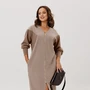 Платье полуприлегающего силуэта, вырез горловины V – образный, рукав цельнокроеный спущенный со вставками из кожи и на манжете внизу. По спинке кокетка, в боковых швах функциональные карманы. Застежка на тесьму-молнию. В комплекте ремень из экокожи.
