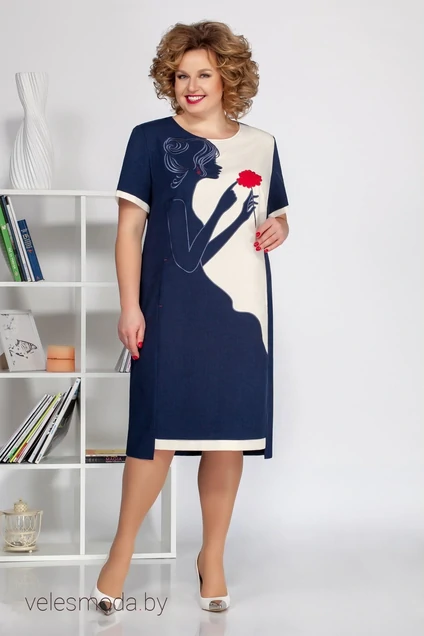 Платье женское, с горловиной овальной формы. Декорировано вышивкой - аппликацией. Спереди отрезные бочки, в которых обработаны карманы. Спинка с двойной кокеткой, небольшим вырезом. Рукав втачной, одношовный, короткий Низ изделия имеет фигурную форму - укорочено по переду и удлиненно по спинке Длина платья 107см Длина рукава 23см Ширина рукава 19,5/20,5/21,5