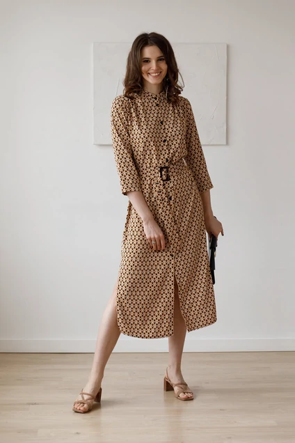 Свободное платье рубашечного кроя с воротником-стойкой и сборкой из-под кокетки, по бокам разрезы, что дает дополнительную свободу движениям. Пояс выгодно подчеркнет талию. В этом платье вы создадите идеальный образ на каждый день.