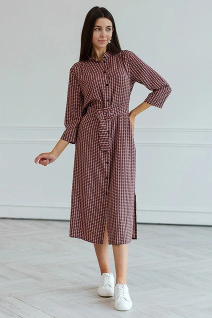 Свободное платье рубашечного кроя с воротником-стойкой и сборкой из-под кокетки, по бокам разрезы, что дает дополнительную свободу движениям. Пояс выгодно подчеркнет талию. В этом платье вы создадите идеальный образ на каждый день.
