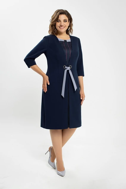 Элегантное, женственное платье полуприлегающего силуэта, с имитацией платья и кардигана, длиной до середины колена, с двушовным втачным рукавом длиной 3/4. Спинка с талиевыми вытачками, со средним швом, в котором обработана застежка на потайную тесьму-«молнию». Перед с отлетными деталями, вставленными в плечевой, пройму и боковой. Отлетные детали с наклонными подрезами, с рельефами от пройм до подреза. Нижняя деталь переда с рельефами от пройм до низа. В боковых швах обработаны карманы. По горловине воротник из отделочной ткани. По низу рукава съемные манжеты из отделочной ткани. На отлетных деталях переда в области линии талии пробиты люверсы, в которые протянут поясок. По горловине между углами воротника пришит декоративный элемент из пластика с логотипом фирмы.