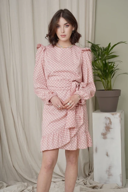 Платье молодежное отрезное по талии на подкладке приталенного силуэта с обьемным втачным рукавом рубашечного типа,длиной до запястья с резинкой по низуи оборками по окату,с застежкой по спинке на молнию потайную, с карманами в боковом шве. По лифу переда и спинки рельефы от плеча до линии талии.По нижней части переда подрез с иммитацией запаха и оборкой переходящей на спинку.Линия талии подчеркнута завязывающимся поясом. Платье длина 90см, ширина на уровне глубины проймы 46,48,50,52 см (42,44,46,48рр),ширина по талии 44,46,48,50 (42,44,46,48рр). Длина рукава 61см., ширина на уровне бедер 50,52,54,56см,(42,44,46,48рр