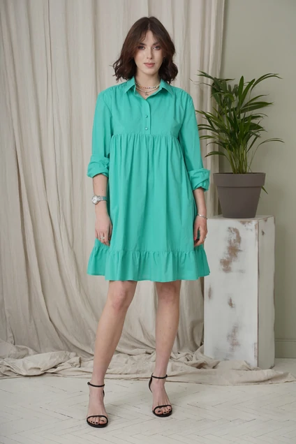 Платье молодежное из натуральной хлопковой ткани, трапециевидного силуэта со слегка спущенной линией плеча,с застежкой по лифу переда на две петли и пуговицы.Изделие на подкладке с рукавом рубашечного типа с притачной манжетой по низу с застежкойна петлю и пуговицу,с воротником по линии горловины.Перед с кокеткой по плечам и сборкой по линии кокетки.Линия талии по переду и спинке завышена,в боковых швах карманы.По низу изделия оборка.Платье длина 89см. ширина на уровне глубины проймы 47,49,51,53 см (42,44,46,48рр) . Длина рукава 59см ., ширина на уровне бедер 85,87,89,91см, на уровне талии 82,84,86,87см.