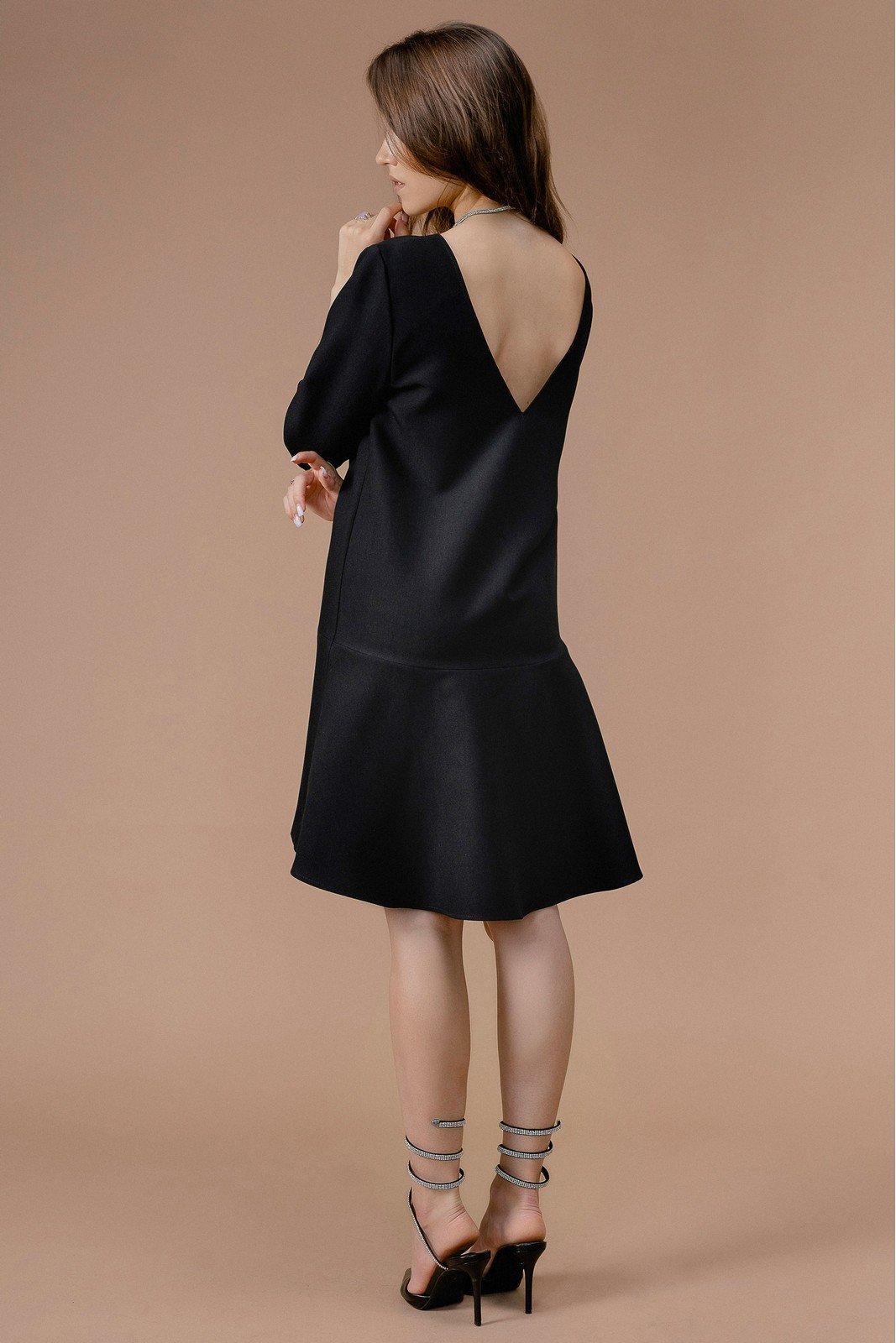Платье женское трапециевидного силуэта ,без застежки,с рукавом 3/4 рубашечного типа.с потайными молниями по низу.Перед отрезной по линии бедер с карманами с потайными молниями.По спинке V- образный вырез.По нижней части спинки отрезная линия фигурной фориы с воланом с коническим расширением.