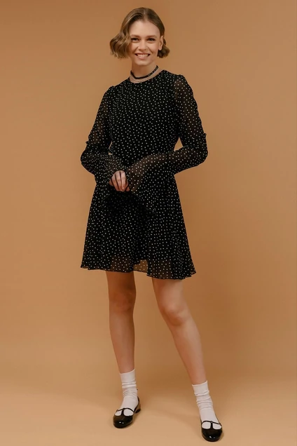 Платье молодежное из ткани шифон приталенного силуэта,отрезное по линии талии с активным расширением по низу,застежка молния в среднем шве юбки спинки.Рукав рубашечного типа с кокелье по низу.Спинка с вырезом по лифу и завязкой по горловине. На подкладке.
