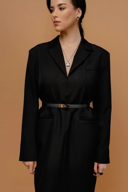 Платье сюртук прямого силуэта из ткани однотон на подкладке с застежкой молнией в ле.бок.шве,с втачным рукавом длиной до запястья ,воротник пиджачного типа.Перед с карманами ниже линии талии с листочкой.Шлица по спинке по низу изделия.В левом боку в шве потайная молния,для удобства надевания. изделия.