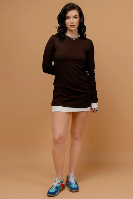 Сет ( комплект) состоит из двух равноценных изделий разного цвета. Джемпер женскийудлиненный( логслив удлиненный)из трикотажного полотна прилегающего силуэта,с втачным рукавом.