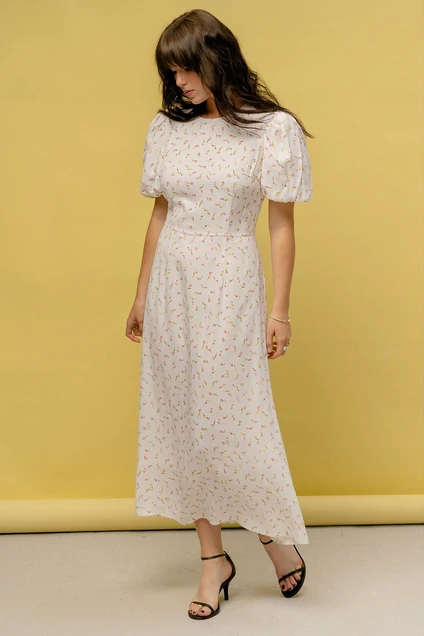Платье женское из ткани вискоза на подкладке.Приталенного силуэта, рукав рубашечного типа со сборкой по окату и по низу.Отрезное по линии талии с застежкой молнией в среднем шве по спинке. Длина платья 127 см,
