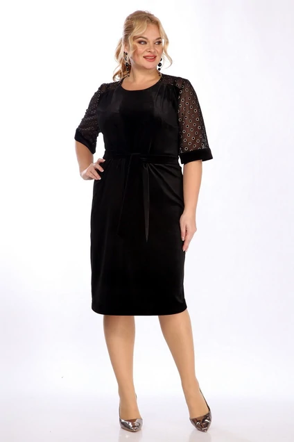 Платье женское, нарядное, полуприлегающего силуэта изготовлено из велюра на трикотажной основе и сетки. Горловина круглой формы, перед с кокетками и складками. По спинке фигурная вставка из отделочной ткани. Рукава втачные, по низу планка длиной ниже локтя. Пояс из отделочной ткани.
