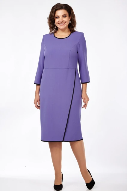 Платье женское прямого силуэта из плательной ткани. Горловина круглой формы. По переду рельефы, отрезное по талии, по юбке элемент запаха. По спинке средний шов, по горловине разрез с застежкой на потайную петлю и пуговицу. Отделка в виде окантовки горловины, низа рукавов, отлетных деталей юбки. В комплекте съемный пояс с металлическими наконечниками.