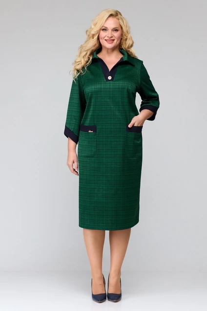 Платье женское прямого силуэта, изготовлено из трикотажного полотна. По горловине воротник рубашечного типа и планки из отделочной ткани с декоративной пуговицей. По переду нагрудные вытачки, накладные карманы с отделочной планкой. И пришитым логотипом. По спинке средний шов с разрезом внизу. Рукава втачные с фигурными манжетами из отделочной ткани.