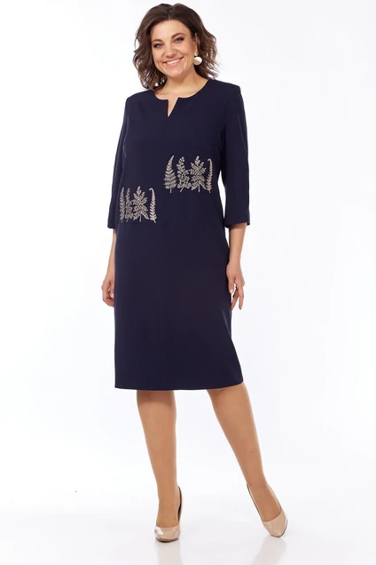 Платье женское прямого силуэта из плательной ткани. Горловина округлой формы с фигурным вырезом. Перед с нагрудными вытачками и с ассиметричными подрезами над которыми расположена вышивка. Спинка со средним швом, в нем обработана шлица. Шов декорирован пуговицами. Рукава втачные со встречной складкой.