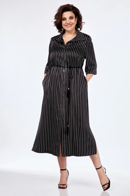 Платье женское А-силуэта из лёгкой, летящей, плательной ткани. Воротник рубашечного типа, застежка центральная, планка на петли и пуговицы. По переду нагрудные вытачки, спинка цельнокроеная. В боковых швах обработаны карманы. Рукава втачные с отложными манжетами по низу. В комплекте декоративный пояс-шнур с кисточками.