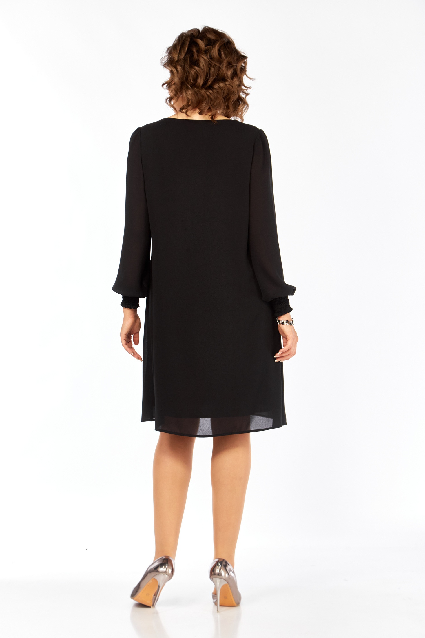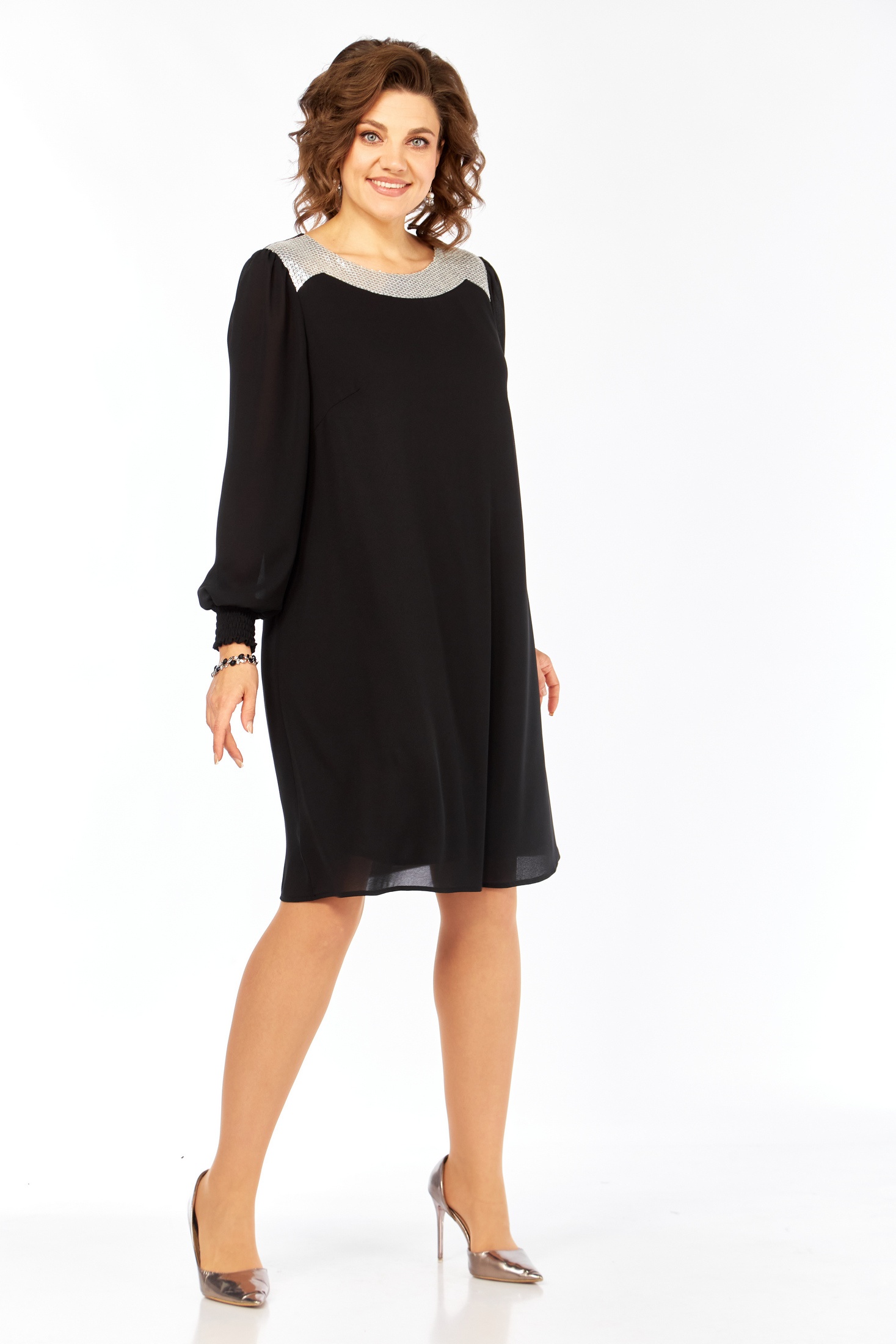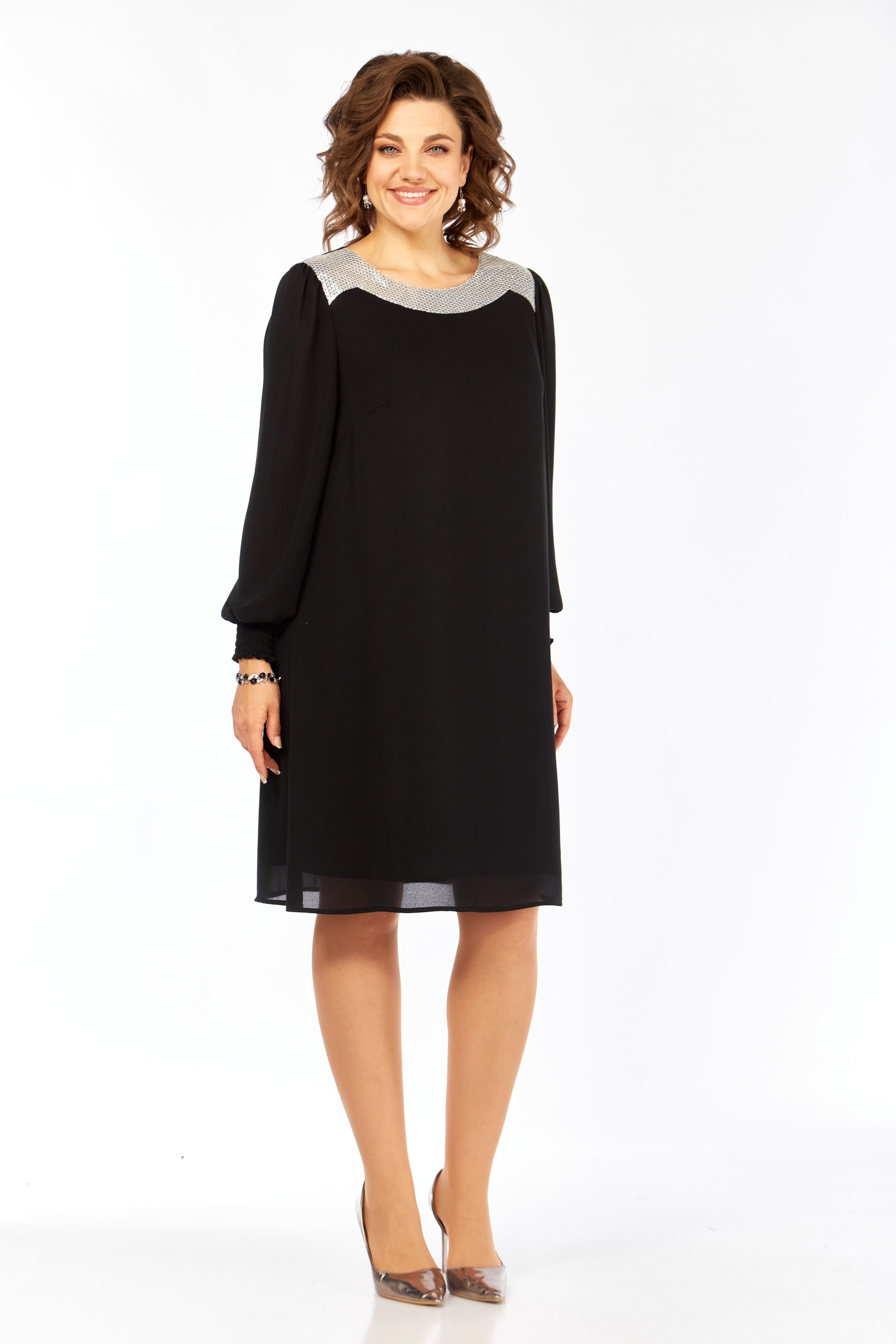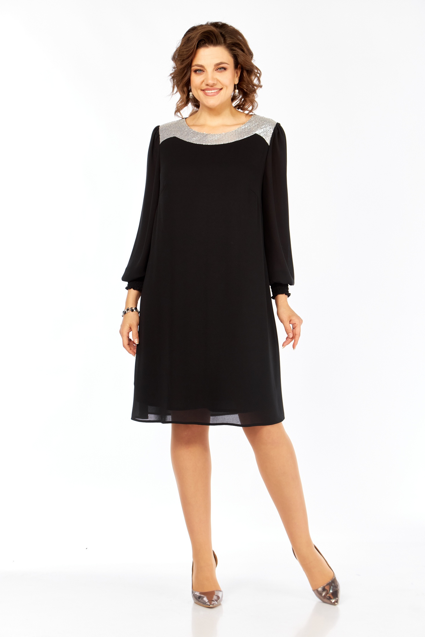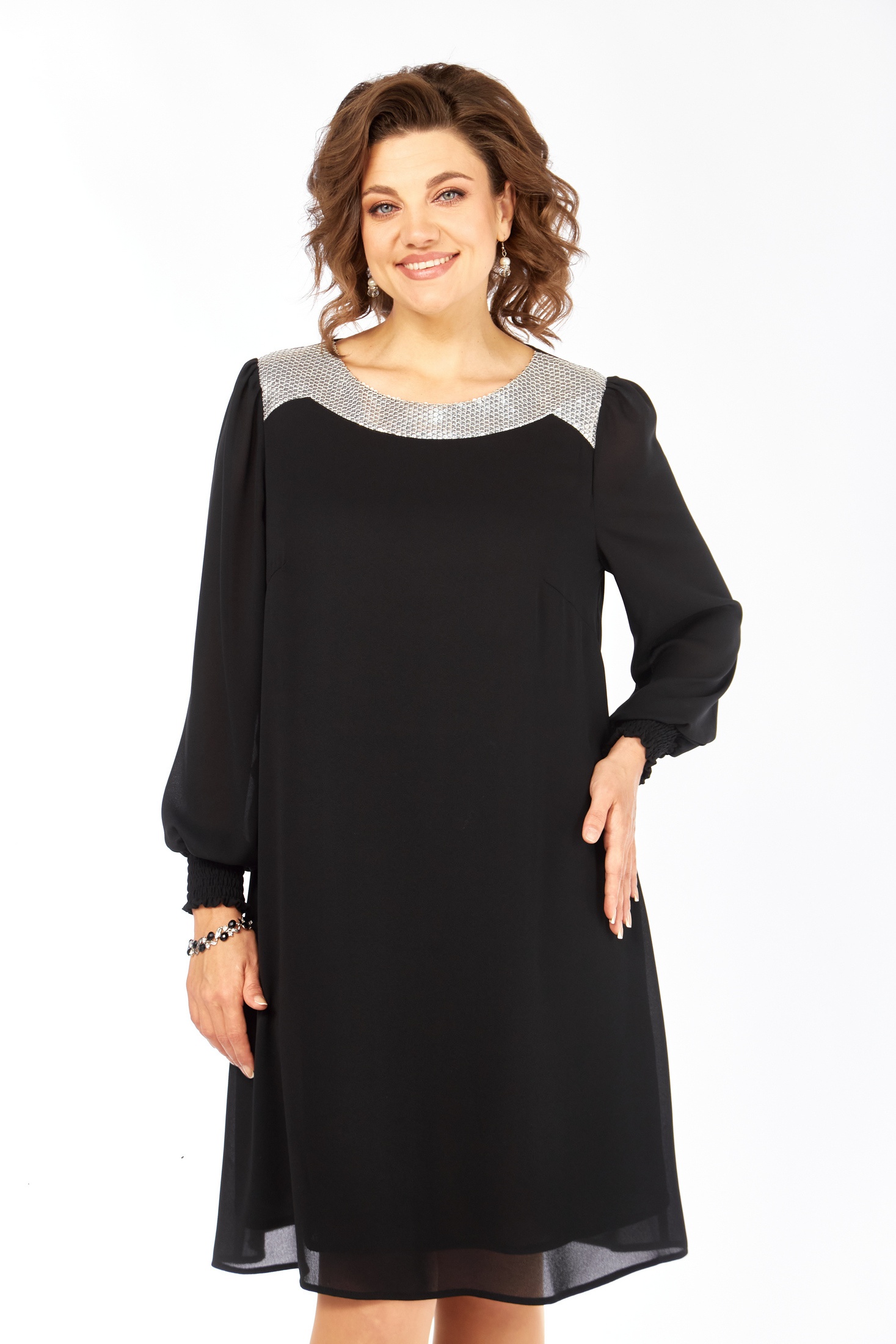 Представляем элегантное черное платье, выполненное из струящегося креп-шифона, который обеспечивает превосходное падение и легкость. Платье А-силуэта, завершенное трикотажной подкладкой, предлагает идеальное сочетание комфорта и стиля. Дизайн украшен оригинальной отрезной фигурной кокеткой из пайеток на передней части, добавляющей изысканный блеск образу. Форма платья дополнена нагрудными вытачками, которые подчеркивают силуэт. Рукава длиной 64 см со сборкой по окату и низу, завершены элегантными отрезными манжетами на резинке, что добавляет мягкой изящности. Длина платья по спинке составляет 97 см, идеально подходя для различных событий. Это платье — идеальный выбор для тех, кто ценит утонченность и комфорт.