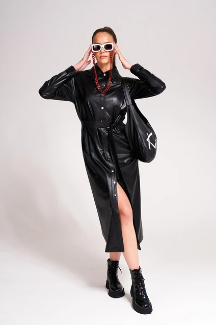 Дизайнерское платье прямого силуэта с двойным отложным воротником выполнено из экокожи на хлоковой основе.Платье рубашечного типа. Перед платья с планкой застегивающейся на кнопки.