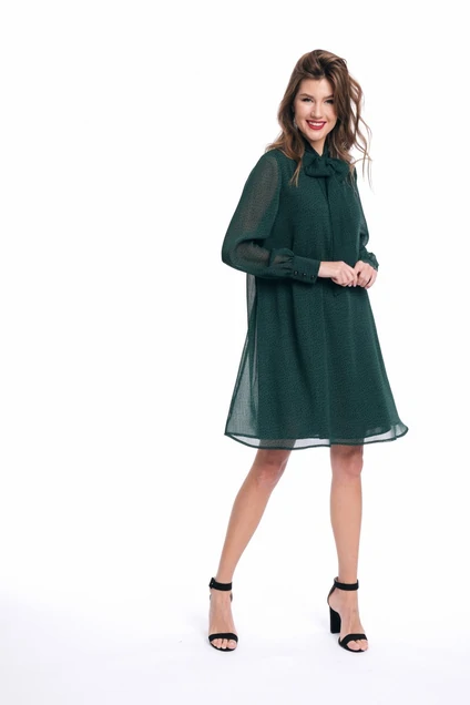 Платье свободного силуэта, расширенное к низу, выполнено из шифонового полотна с воротником-стойкой переходящим в бант. Рукава в изделии втачные одношовные со сборкой по низу с отрезной манжетой на 3 петли и пуговицы. Платье на подкладке. Ремень не входит в комплект.