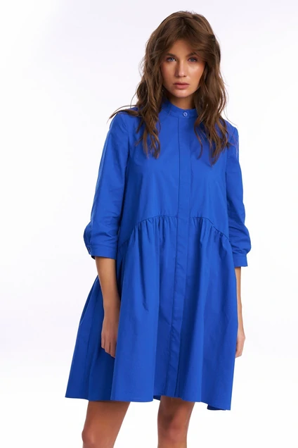 Платье женское из хлопкового материала А-силуэта с подрезом по переду и по спинке. По верхнему срезу нижней детали переда и спинки - сборка. Воротник-стойка. Рукава ¾ втачные одношовные. По низу рукавов - отрезная манжета застегивающаяся на пуговицу . Застежка центральная на петли и пуговицы. Длина изделия - 92 см Длина рукава -45,5 см
