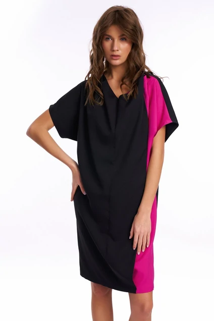 Платье женское, прямого силуэта, свободного объема, из плательной ткани. Перед платья выполнен из двух цветов ткани. Предлагается в 2-х вариантах: 1. Может быть застегнуто на запах 2. Может быть спадающее свободными складками. На переде платья по линии плеча расположено 3 складки. Длина платья до линии колена.