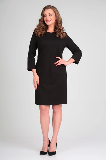 Платье полуприлегающего силуэта, с 3/4 рукавом, выполнено из трикотажно-текстильного полотна. Передняя часть с двумя нагрудными вытачками, спинка разрезная по среднему шву со шлицей и двумя талиевыми выточками.Спинка со средним швом с застежкой на потайную тесьму-молнию. Горловина округлой формы. Длина платья (по спинке) – 95 см. Длина рукава (платья) – 50 см