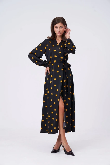 Платье на запах из струящейся плательной ткани в контрастный принт. По талии втачной пояс, переходящий в длинные завязки. Также с внутренней стороны изделия есть дополнительная завязка для фиксации. Рукав полноценной длины на манжете. Юбка разведена трапецией