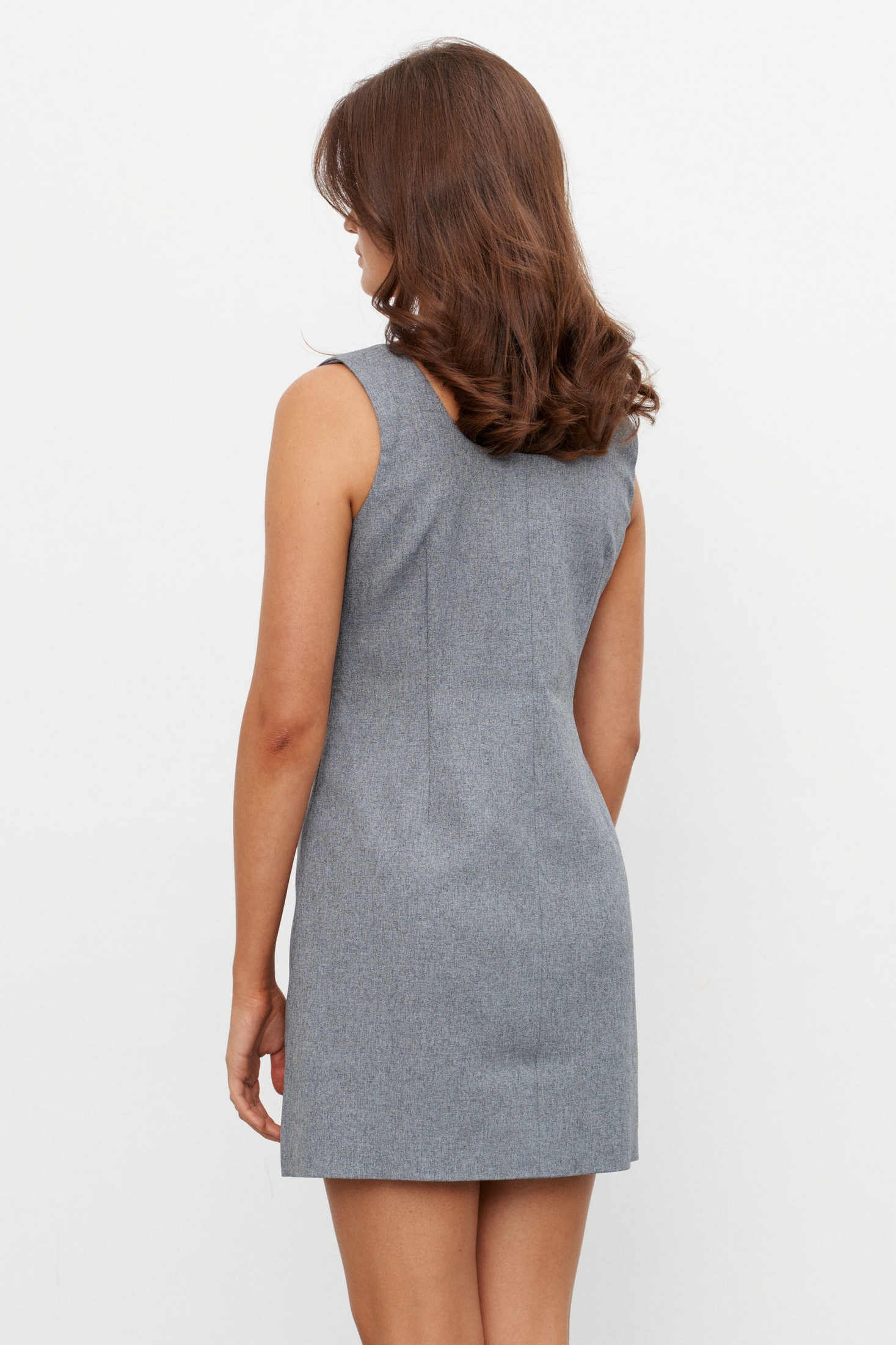 Элегантное платье-футляр серого цвета создает современный и утонченный образ. Это платье отличается прилегающим силуэтом, который подчеркивает фигуру, а его длина выше колена делает модель идеальной выбором для деловых и повседневных мероприятий. Простоту дизайна акцентирует круглая горловина и застежка на декоративные пуговицы спереди. Модель выполнена без принтов, сохраняя утонченность и лаконичность. Идеально подойдет для создания образа в сочетании со светлой блузой или легкой кофтой.