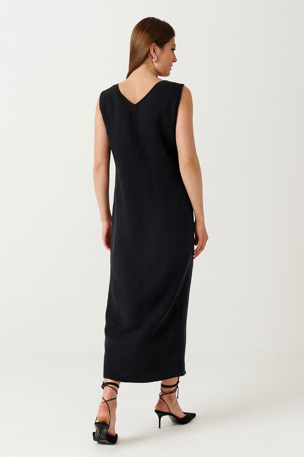 Платье полуприлегающего силуэта выполнено из льняной ткани. Характеристики: Горловина V- образная. По переду средний шов заканчивающийся встречной складкой. Длина до середины голени.