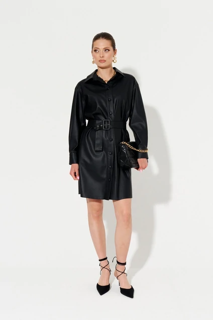 Платье женское из смесовой ткани для повседневной носки прямого силуэта. Перед имеет два накладных кармана с клапаном, застежка на одну обметанную петлю и одну пуговицу. Перед с цельнокроенной планкой и застежкой на девять обметанных петель и девять пуговиц, Линия плеча чуть сдвинута вперед. Низ изделия чуть скругленный. По спинке имеется кокетка. Горловина обработана рубашечным воротником с отрезной стойкой. Низ рукава обработан притачной манжетой на две обметанные петли и две пуговицы. Для придания формы в области талии имеется регулируемый пояс. Интересный вариант для любого времяпровождения. Удобное и комфортное платье станет вашим фаворитом.