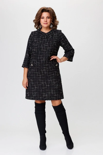 Элегантное женское платье из плотной мягкой ткани с добавлением хлопка. Длина чуть выше колена, силуэт расширенный к низу, вырез горловины круглый с воротником рубашечного типа и застежкой на потайную молнию по спинке, по переду листочки украшенные декоративными пуговицами.