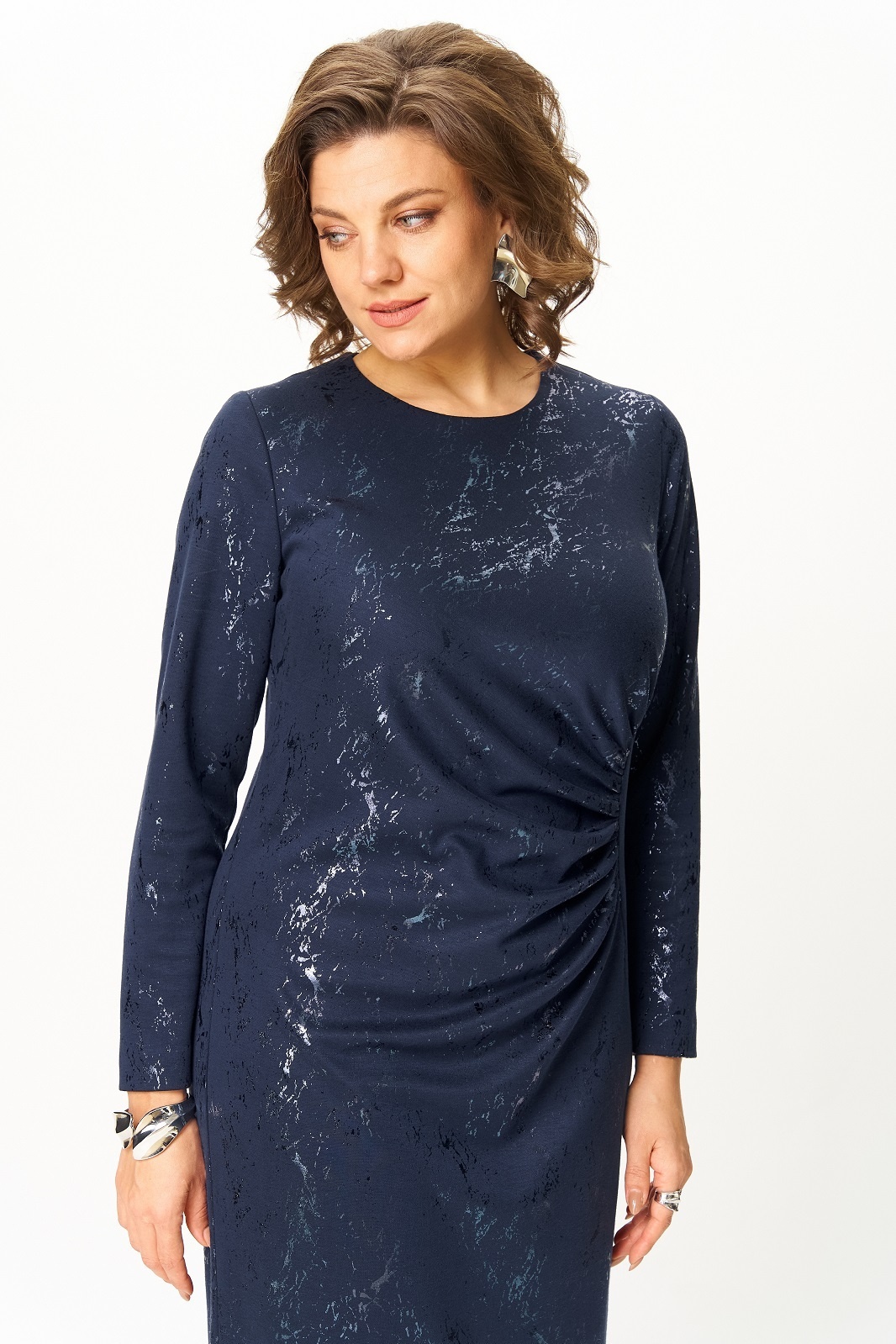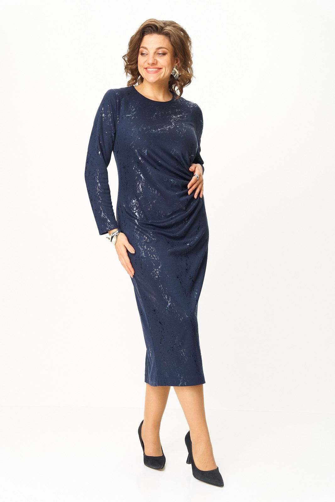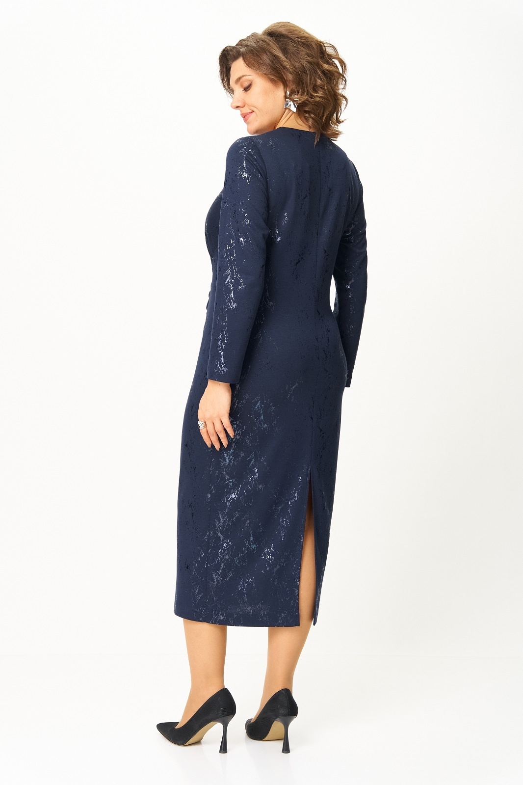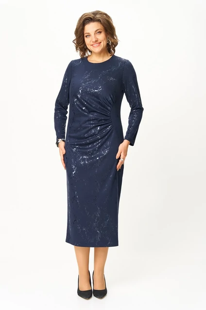 Элегантное женское платье из трикотажного полотна с добавлением вискозы, представлено в насыщенном синем цвете с блестящим рисунком, выполненным в тон основного цвета. Эффектное дизайнерское решение включает прилегающий силуэт, удлиненный крой, что визуально вытягивает фигуру. На передней части платья представлена оригинальная фигурная драпировка, подчеркивающая изящество линий. Круглый вырез горловины и длинные рукава добавляют изделию изысканности. По спинке расположена потайная молния и элегантный разрез, обеспечивающий удобство при ходьбе. Этот стильный наряд идеально подойдет для вечерних мероприятий и специальных случаев.
