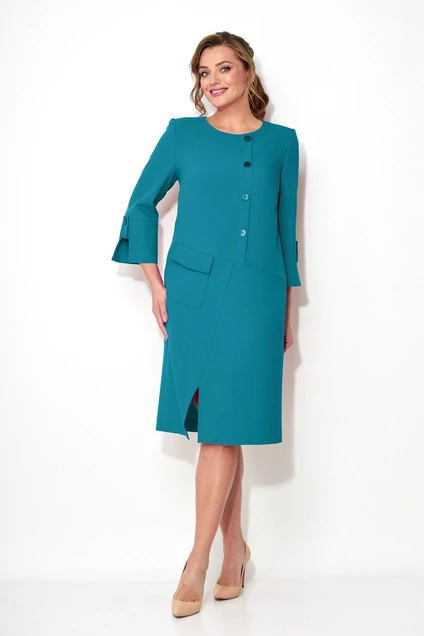 Нарядное женское платье из ткани средней плотности с добавлением вискозы и стрейча.Силуэт прямой, длина чуть ниже колена, вырез горловины круглый с застежкой на молнию по спинке.По переду наклонные подрезы с небольшим разрезом внизу,вертикальная декоративная планка с пуговицами и накладной карман с клапаном.Рукав длинный с высоким отрезным манжетом и декоративной патой с пуговицей.