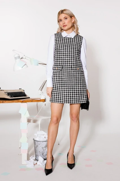 Прямая женственная модель на каждый день — без рукавов, с нагрудными вытачками и декоративными клапанами. Плотная ткань в гусину. лапку выглядит уютной и хорошо держит форму. Благодаря шелковистой подкладке платье можно носить отдельно или комбинировать с блузами и водолазками. Застежка на потайную молнию в среднем шве спинки. Длина - 81 см.